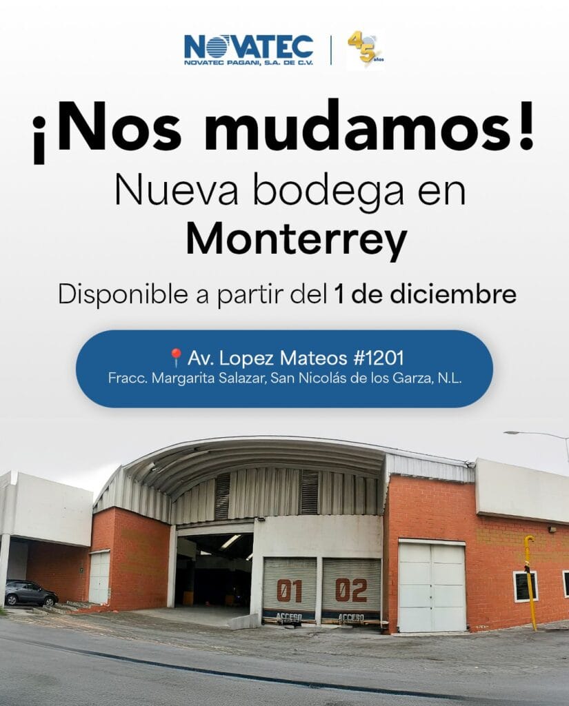 A partir del 1 de diciembre estaremos operando desde nuestra nueva bodega en Novatec Monterrey, para seguir brindándote la misma calidad y servicio que nos distingue.